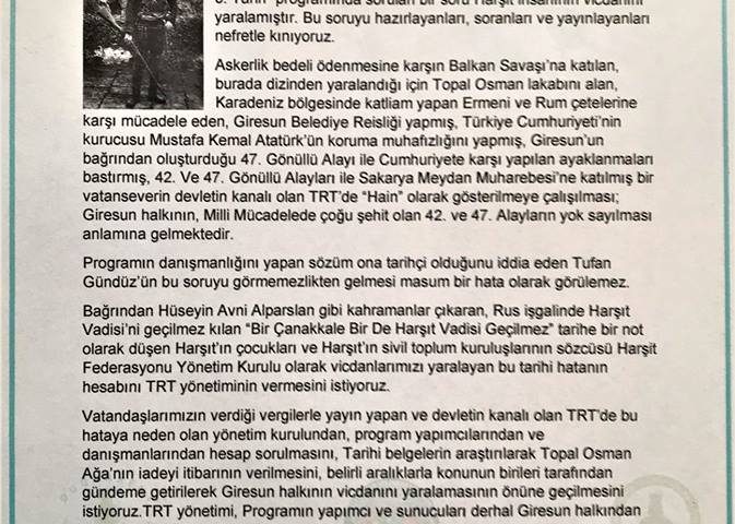 TRT’de yayınlanan 3 te 3 Tarih yarışma programında sorulan bir soru üzerine Harşit Federasyonu ve bağlı dernek yönetimleri bir bildiri yayınladı.