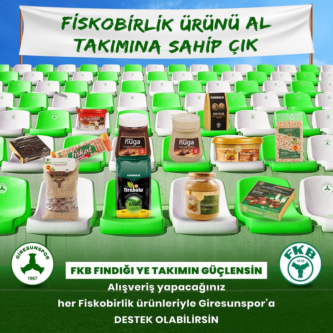 Giresunspor Kulübümüz ve FİSKOBİRLİK arasından yapılan protokolle, FİSKOBİRLİK Satış Mağazalarından yapılan ürün alışverişinden Giresunspor’a %4 pay verilecek. Böylece FKB’den alış-veriş yapıp fındık yediğinizde hem siz güçleneceksiniz hem Giresunspor güçlenecek.