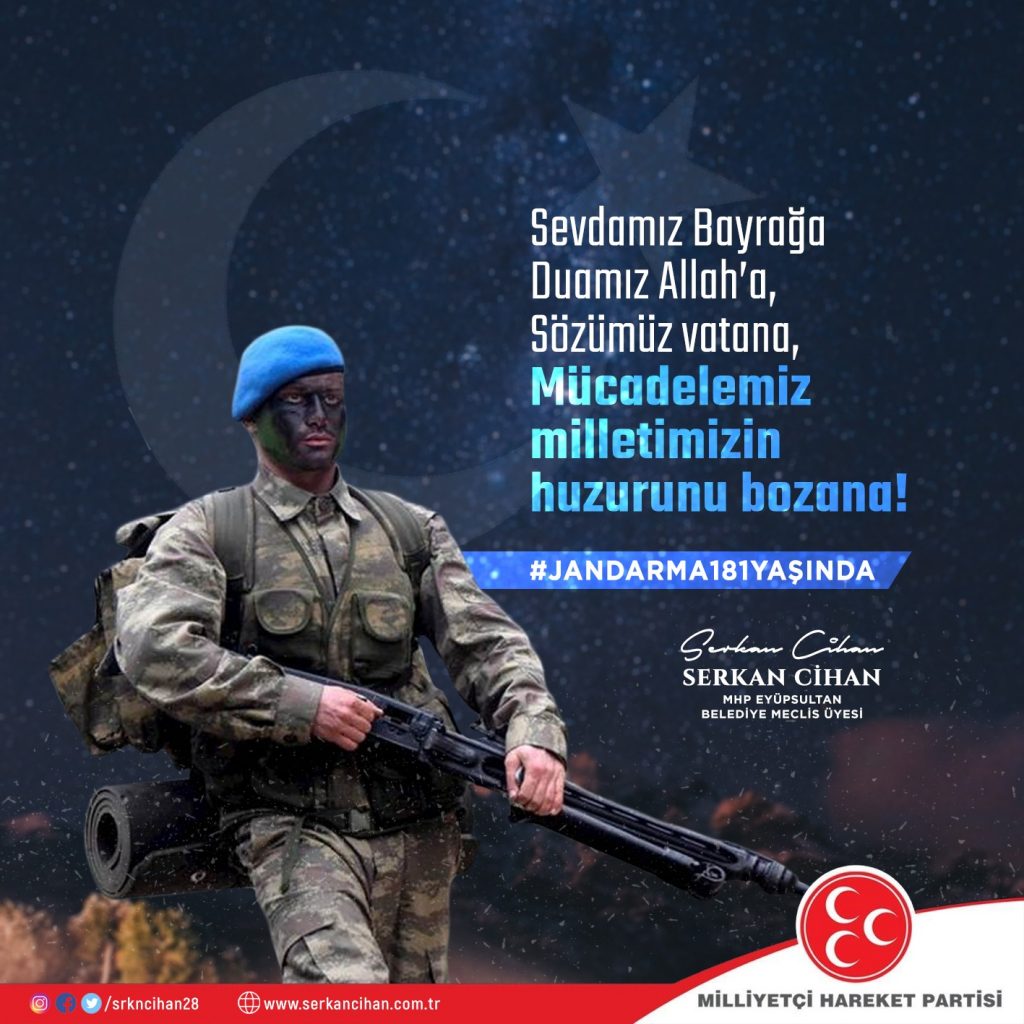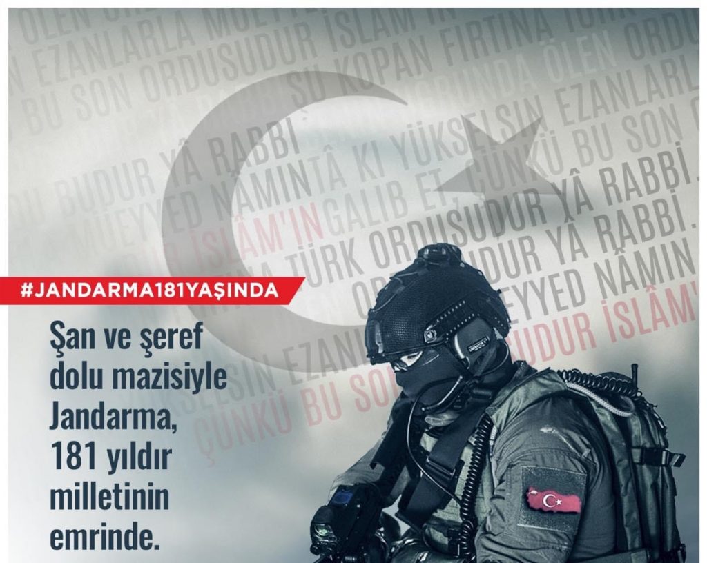 Jandarma Teşkilatımızın 181’inci kuruluş yıldönümünde hiyerarşik zincirde en üstten el alta bütün kahraman Jandarmalarımızı kutluyor, şehadete ulaşan jandarmalarımıza Allah’tan rahmet niyaz ediyorum.