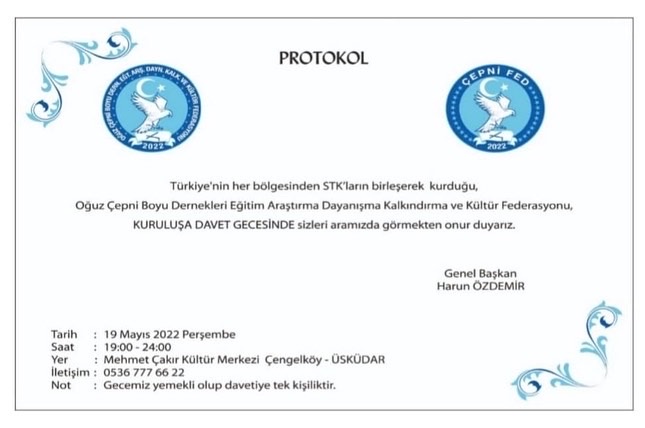 Kurucu derneklerinden olduğumuz Oğuz Çepni Bpyu Dernekler Federasyonumuzun bu akşam Üsküdar’da yapılacak kuruluş gecesi ve birinci olağan kongresinde Harun Özdemir ve ekibine başarılar diliyoruz