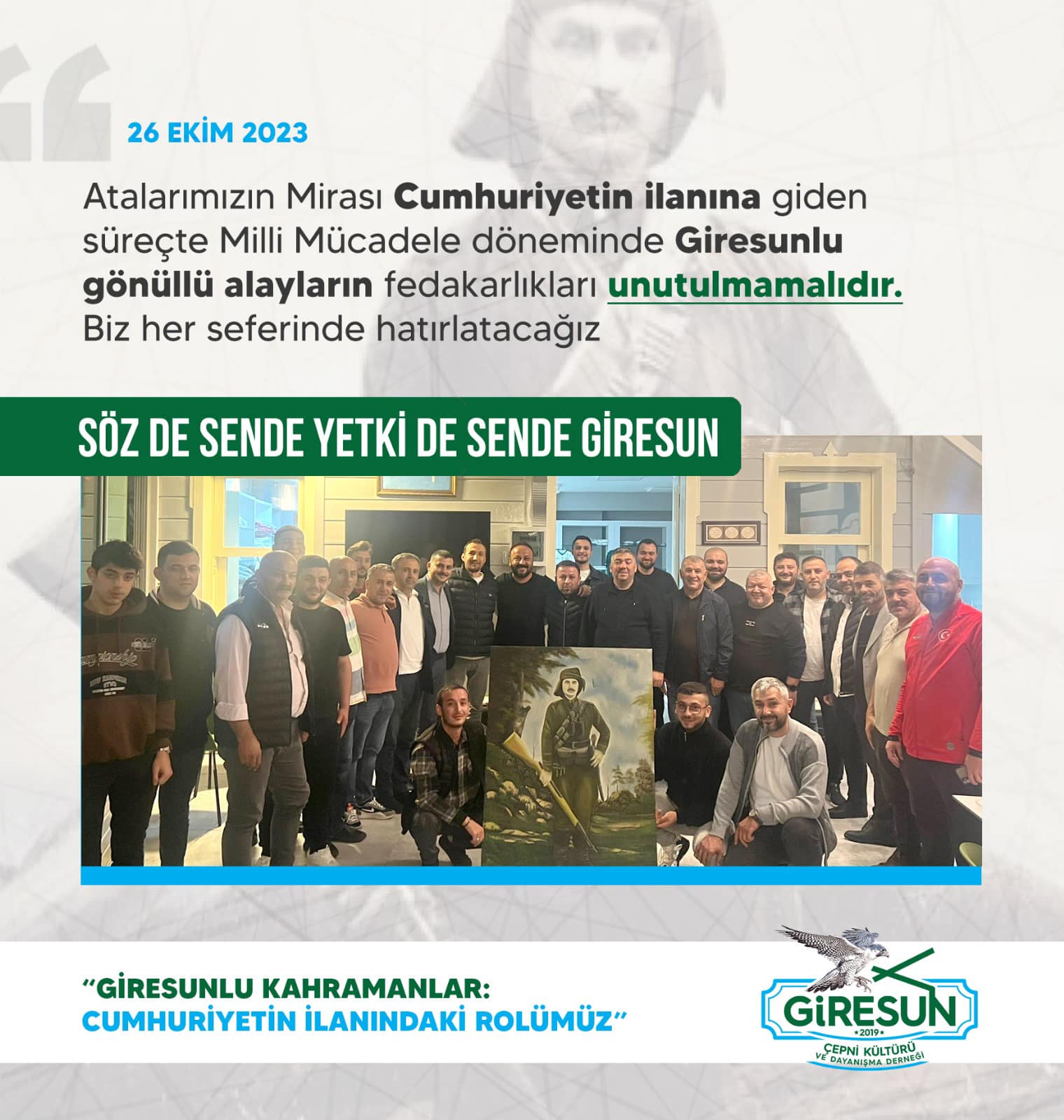 Giresun Çepni Derneği olarak Eyüpsultan meydanında bulunan merkezimizde “Giresunlu Kahramanlar: Cumhuriyetin İlanındaki Rolümüz” konulu…