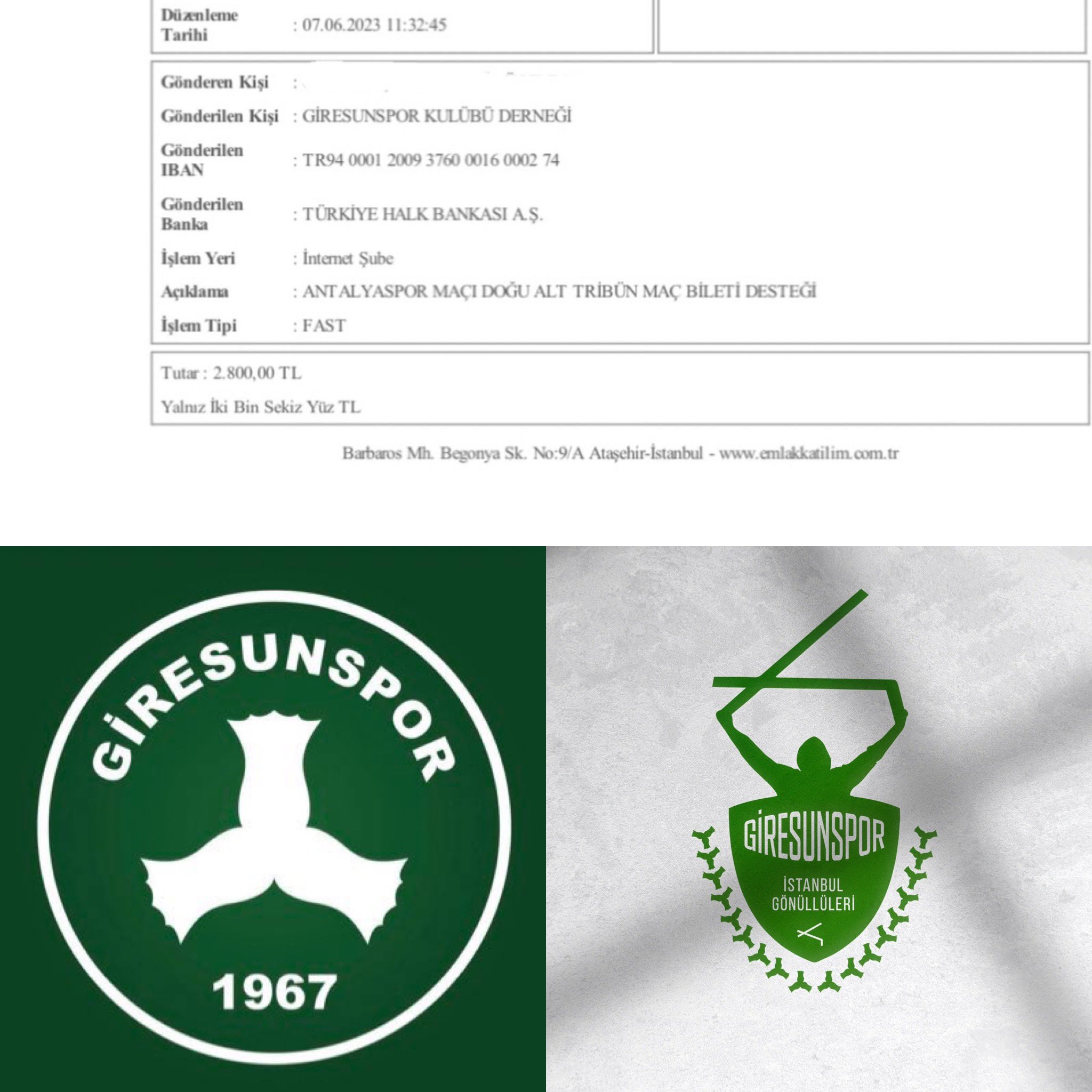 GİRESUNSPOR İSTANBUL GÖNÜLLÜLERİ OLARAK 100 BİLET KARŞILIĞI 2800 TL GİRESUNSPOR KULÜBÜ HESABINA YATIRILMIŞTIR