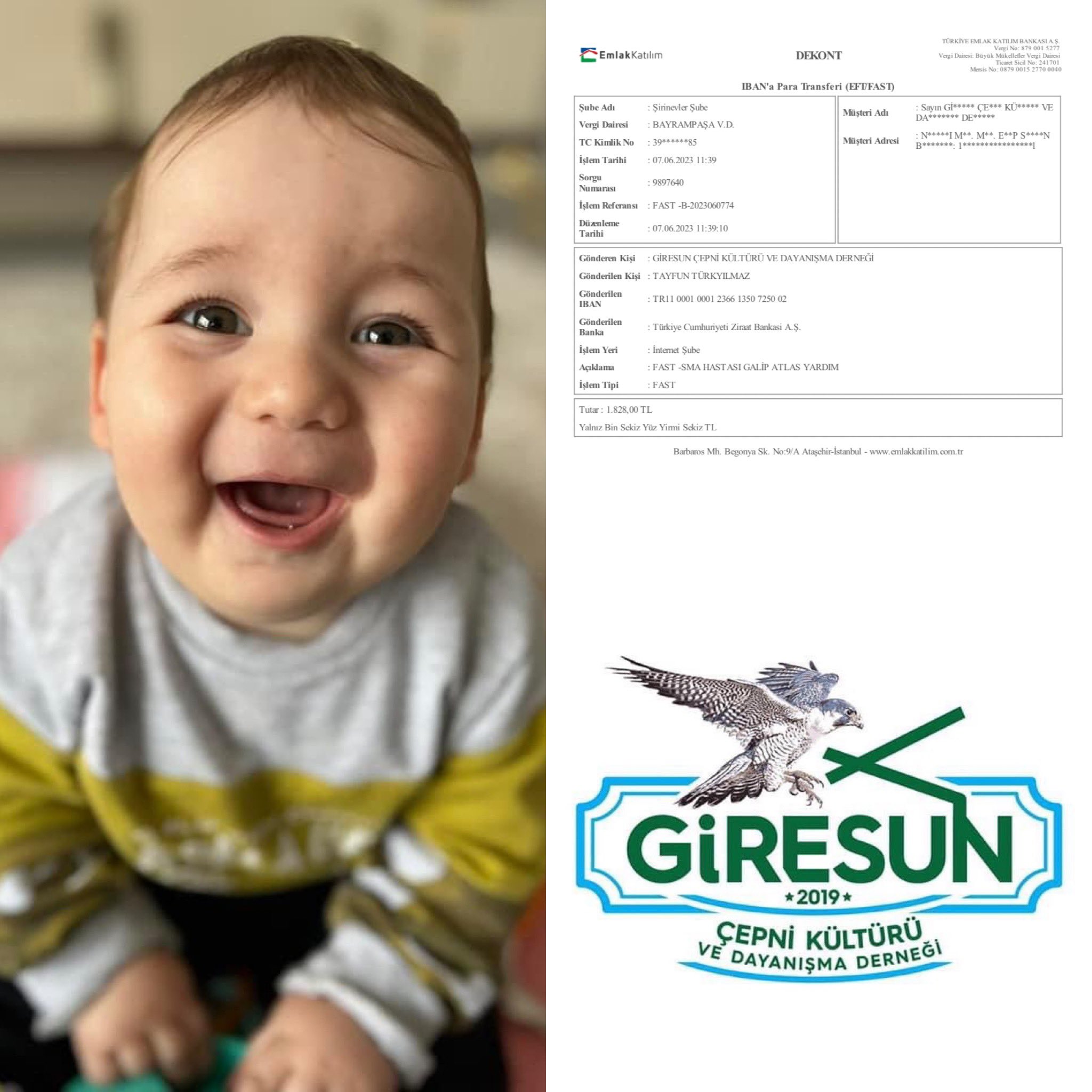 #GiresunÇepniDerneği olarak SMA hastası GİRESUNLU bebeğimiz #GalipAtlasTürkyılmaz’ın kampanyasına 1828 TL nakit bağışta bulunduk. Galip…