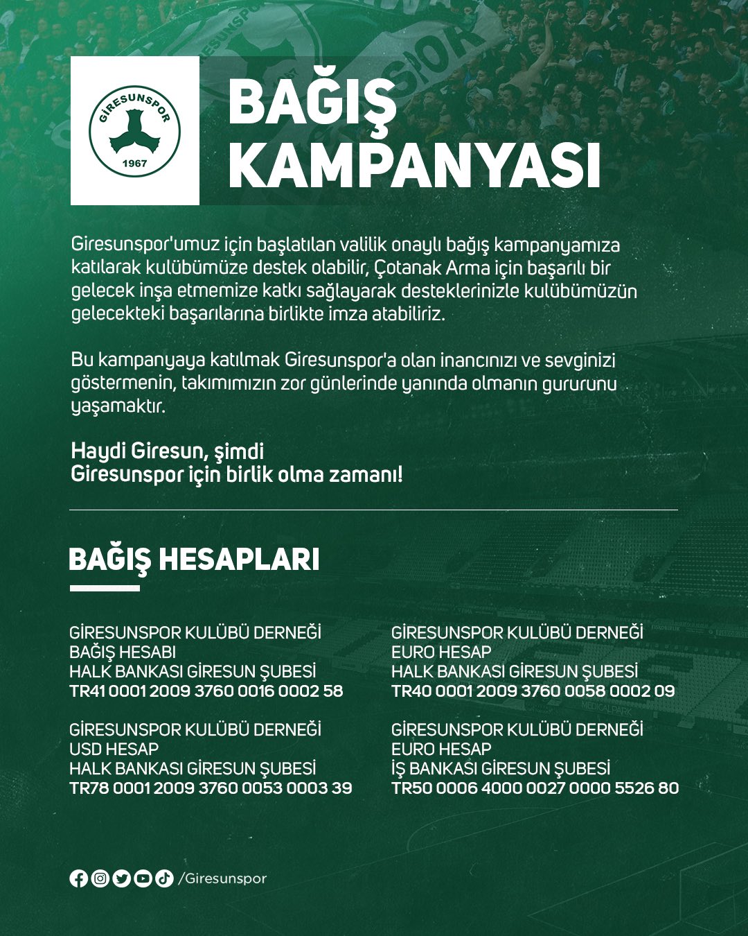 Giresunspor’umuz için başlatılan valilik onaylı bağış kampanyamıza katılarak kulübümüze destek olabilir, Çotanak Arma için…