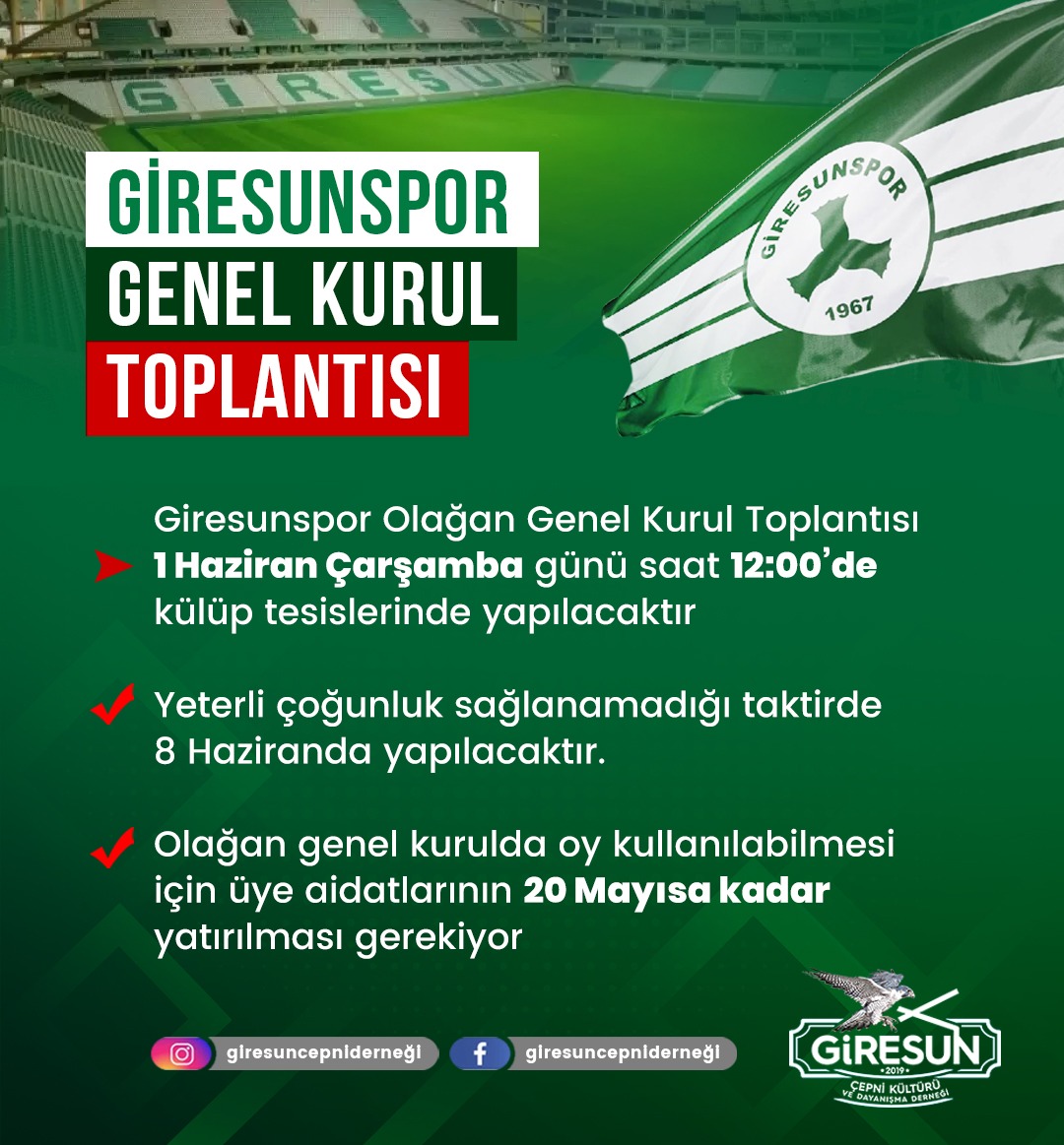 Giresunspor Olağan Genel Kurul Toplantısı 1 Haziran Çarşamba günü saat 12:00’de külüp tesislerinde yapılacaktır…