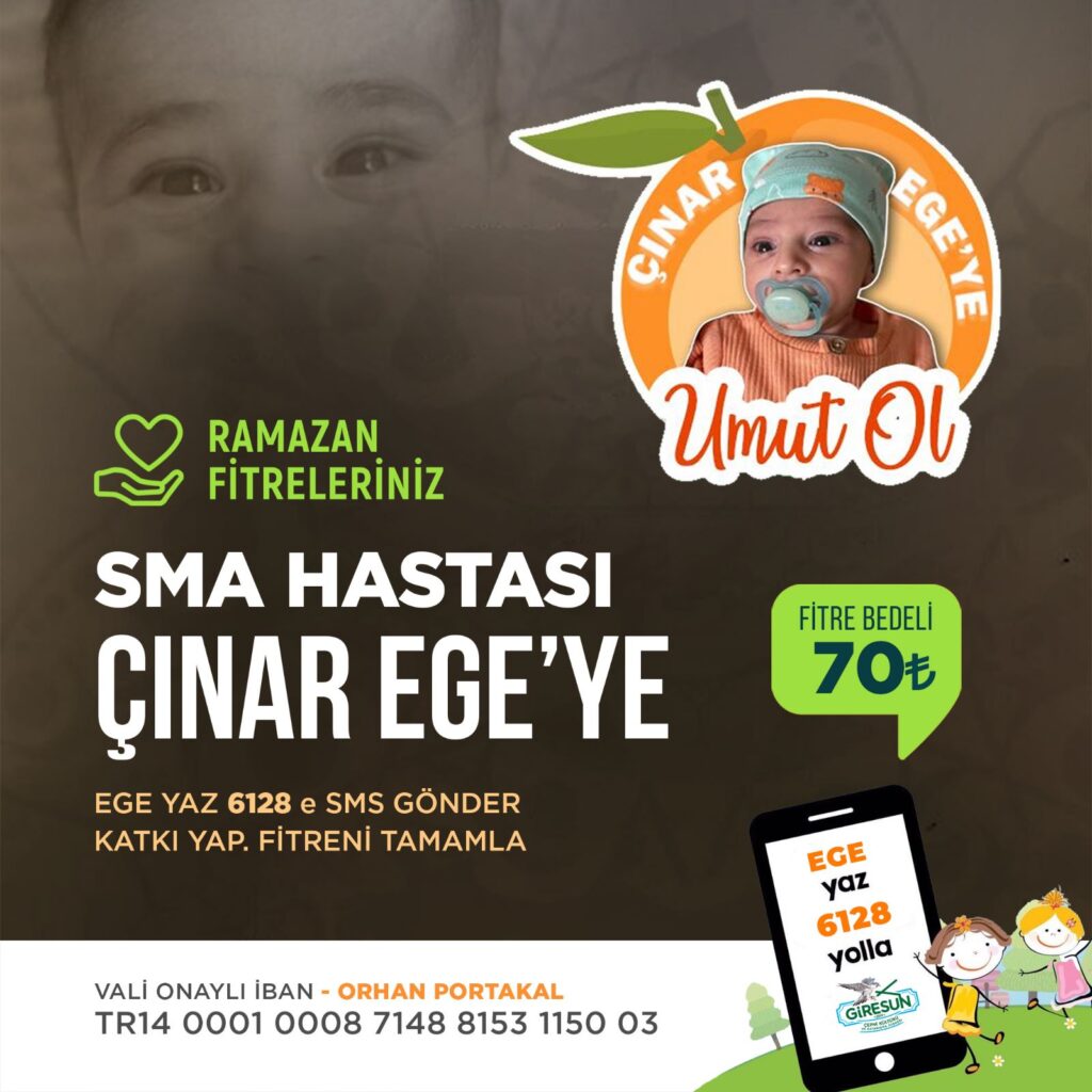 Ramazan ayı fitrelerinizi SMA hastası Çınar Ege Portakal için vermek isterseniz ; Valilik izinli, IBAN:TR14 0001 0008 7148 8153 1150 03 Ziraat Bankası Alıcı adı: Orhan PORTAKAL