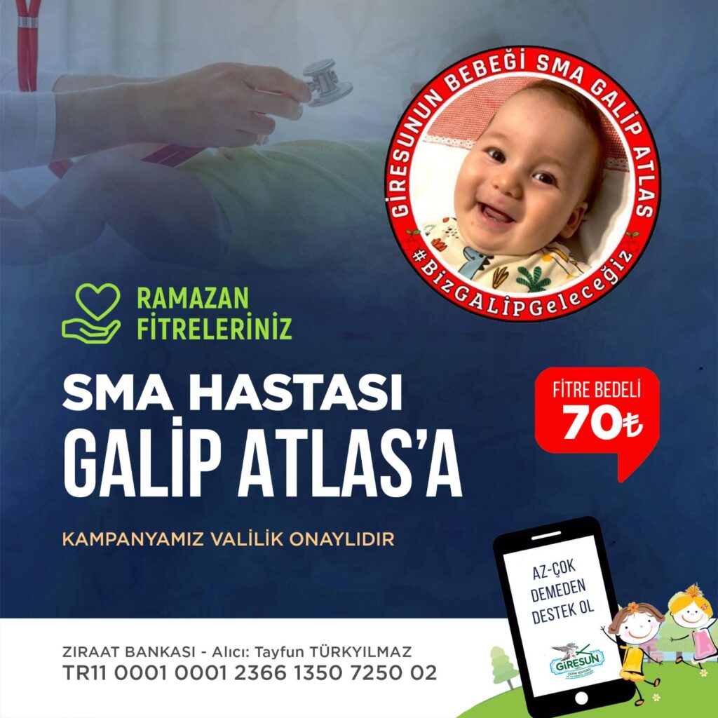 Ramazan ayı fitrelerinizi SMA hastası Galip Atlas Türkyılmaz’a vermek isterseniz ; Valilik İzinli , İBAN : TR11 0001 0001 2366 1350 7250 02 Ziraat Bankası ALICI: Tayfun TÜRKYILMAZ