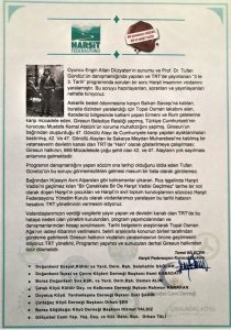 Oyuncu Engin Altan Düzyatan’ın sunumu ve Prof. Dr. Tufan Gündüz’ün danışmanlığında yapılan ve TRT’de yayınlanan “3 te 3. Tarih” programında sorulan bir soru Harşit insanının vicdanını yaralamıştır. Bu soruyu hazırlayanları, soranları ve yayınlayanları nefretle kınıyoruz.