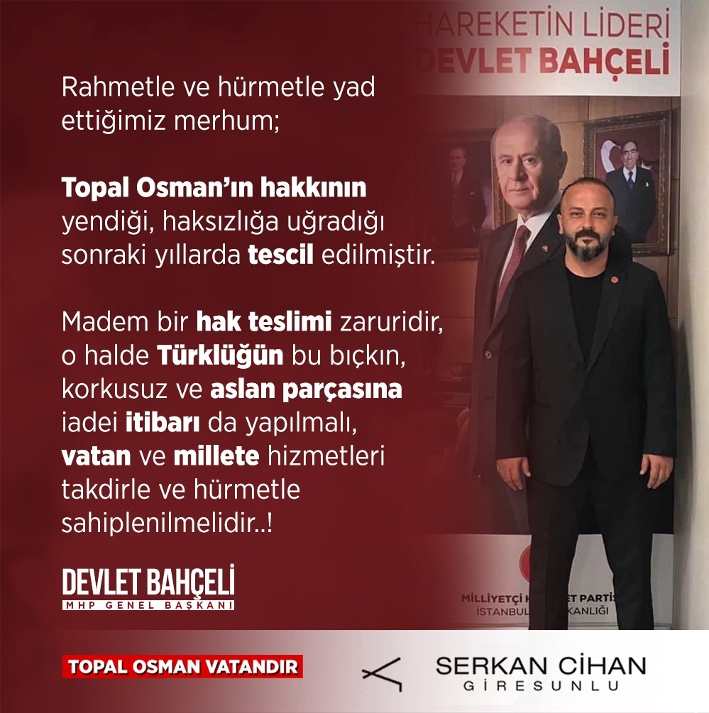 Rahmetle ve hürmetle yad ettiğimiz merhum Topal Osman’ın hakkının yendiği, haksızlığa uğradığı sonraki yıllarda tescil edilmiştir.